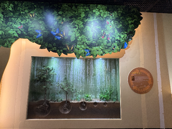 나무 뿌리 단면을 그대로 재현한 전시, 나뭇잎 위 나비 연출, 숲 속 조명까지…
