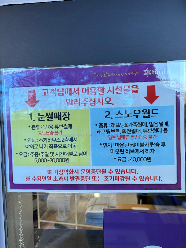 마운틴매표소에서 티켓팅 완료 -> 운단고도케이블카 탑승 -> 처음 케이블카 문이 열리는 곳에서 하차 -> 스노우월드 도착